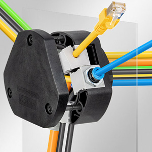 With the new distribution box, centrally routed cables can be distributed 360° in all desired directions. Cables with and without connectors can be routed, sealed with IP54 (acc. to 60529) and strain relieved in accordance with EN 62444.